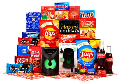 Inhoud Geschenkdoos met strik, 21 x 8,5 x 4 cm Dinerkaarsen, 20 cm, 2 st Waxines, 4 st Kaartspel "Weet jij het?" Servetten, 8 st Rode wijn, Tempranillo, 0,75 ltr Bier, Steenberge, 0,25 ltr, 2 st Hartige zoutjes peper-zeezout, 60 gram Krokante toast, 75 gram Pretzels, 40 gram Pinda's gezouten, 50 gram Chocolade hazelnoot pralines, 110 gram Haribo goudbeertjes, 75 gram Chips Lay's sensations thai sweet chilli, 40 gram Kerstkoekjes, 80 gram Verpakt in een feestelijke geschenkdoos, 39 x 29 x 12,6 cm