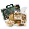 Inhoud Glazen presenteerschaal met goudkleurige rand, Ø, 15 cm Zwarte thee, 20 zakjes, 30 gram Meringue salty caramel, 75 gram Chocolade boomhangers, 87,5 gram Nougatreep amaretti, 75 gram Marshmallows vanille, 150 gram Verpakt in een sfeervol gedecoreerde kerstkoffer, 310 x 180 x 95 mm
