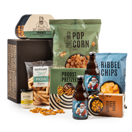 Inhoud Etagere Ø, 20 cm Kaartspel "Weet jij het?" Rode wijn, Tempranillo, 0,75 ltr Bier, Steenberge, 0,25 ltr Servetten, 8 st Richello's chocolade, 100 gr, 8 st Zwarte thee, 5 st Kaaswafelbolletjes, 50 gram Krokante toast, 75 gram Pretzels, 40 gram Koekreep, 110 gram Popcorn, 70 gram Pinda's gezouten, 50 gram Ribbelchips gezouten, 90 gram Haribo goudbeertjes, 75 gram Kerstkoekjes, 80 gram Verpakt in een feestelijke geschenkdoos, 39 x 29 x 17,5 cm