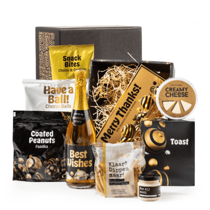 Inhoud Kaartspel "Weet jij het?" Wensbal Rode wijn, Tempranillo, 0,75 ltr Bier, Amstel, 0,33 ltr, 2 st Schulp appelsap, 0,2 ltr Geschenkdoos met strik, 21 x 8,5 x 4 cm Dinerkaarsen, 20 cm, 2 st Waxines, 4 st Zwarte thee, 5 st Hartige zoutjes peper-zeezout, 60 gram Krokante toast, 75 gram Pretzels, 40 gram Kruidcake in a cup, 280 gram Chocolade hazelnoot pralines, 110 gram Pinda's gezouten, 50 gram Stroopwafel, 64 gram, 4 st Napoleon aardbeikogels, 80 gram Mars mini, 18 gram, 2 st Kitkat, 41,5 gram Haribo happy cola, 75 gram Pringles original, 40 gram Lay's chips naturel, 100 gram Doritos bits twisties honey BBQ, 30 gram, 2 st Bruschetta tomato & mozzarella, 70 gram Kerstkoekjes, 80 gram Sweet box inhoud: Geschenkdoos Sweetbox, 16 x 23 x 2,5 cm Boterwafels De la Digue, 10 gram, 3 st Kanjers mini stroopwafels, 8 gram De Ruiter speculoos koekjes, 25 gram Haribo goudbeertjes zakje, 10 gram Lonka nougat caramel, 12 gram Tiny tony chocolonely puur, mini Toblerone, mini* Verpakt in een feestelijke geschenkdoos, 39 x 29 x 17,5 cm