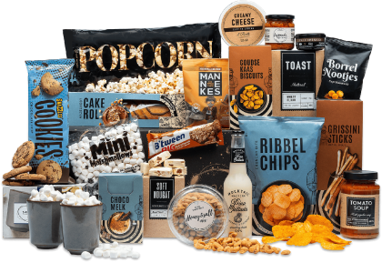 Inhoud Koffiebeker, 340 ml, 2 st Appeltaartmix in bakvorm, 300 gram Ribbelchips zout, 90 gram Thee selectie, 3 smaken Goudse kaas baguettes, 75 gram Pretzels, 100 gram Party toast, 80 gram Rudolph cookies, 150 gram 3D Rudolph cacao rendier, 90 gram Slagroom, 250 gram Chocomelk, 500 ml Popcorn zoet, 50 gram Mallow trees, 140 gram Gratis kaart met eindejaarspuzzel Verpakt in een feestelijke geschenkdoos, 390 x 290 x 130 mm