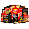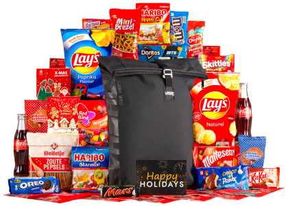 Inhoud Rode wijn, Tempranillo, 0,75 ltr Bier, Amstel, 0,33 ltr Hartige zoutjes peper-zeezout, 60 gram Pretzels, 40 gram Koekreep, 110 gram Chocolade hazelnoot pralines, 110 gram Pinda's gezouten, 50 gram Stroopwafel, 64 gram, 2 st Kitkat, 41,5 gram Haribo happy cola, 75 gram Pringles original, 40 gram Lay's chips naturel, 100 gram Doritos bits twisties honey BBQ, 30 gram Maltesers, 37 gram Kerstkoekjes, 80 gram Verpakt in een feestelijke geschenkdoos, 39 x 29 x 12,6 cm