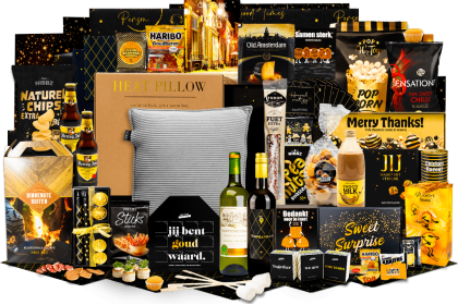 Inhoud Geschenkdoos met strik, 21 x 8,5 x 4 cm Dinerkaarsen, 20 cm, 2 st Waxines, 4 st Kaartspel "Weet jij het?" Servetten, 8 st Rode wijn, Tempranillo, 0,75 ltr Bier, Steenberge, 0,25 ltr, 2 st Schulp appelsap, 0,2 ltr Zwarte thee, 5 st Fuet worst, 150 gram Hartige zoutjes peper-zeezout, 60 gram Kaaswafelbolletjes, 50 gram Krokante toast, 75 gram Pretzels, 40 gram Cake bakmix, 350 gram Koekreep, 110 gram Popcorn, 70 gram Pinda's gezouten, 50 gram Ribbelchips gezouten, 90 gram Chocolade hazelnoot pralines, 110 gram Stroopwafel, 64 gram, 2 st Haribo goudbeertjes, 75 gram Kaaspuntjes, 125 gram Kerstkoekjes, 80 gram Sweet box inhoud: Geschenkdoos Sweetbox, 16 x 23 x 2,5 cm Boterwafels De la Digue, 10 gram, 3 st Kanjers mini stroopwafels, 8 gram De Ruiter speculoos koekjes, 25 gram Haribo goudbeertjes zakje, 10 gram Lonka nougat caramel, 12 gram Tiny tony chocolonely puur, mini Toblerone, mini* Verpakt in een feestelijke geschenkdoos, 39 x 29 x 17,5 cm