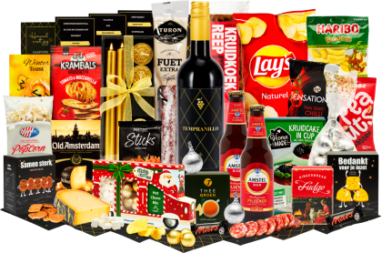 Inhoud Coca cola regular fles, 0,2 ltr Schulp appelsap, 0,2 ltr Zwarte thee, 5 st Hartige zoutjes peper-zeezout, 60 gram Pretzels, 40 gram Chocolade hazelnoot pralines, 110 gram Pinda's gezouten, 50 gram Stroopwafel, 64 gram, 2 st Kitkat, 41,5 gram Haribo happy cola, 75 gram Pringles original, 40 gram Lay's chips naturel, 100 gram Doritos bits twisties honey BBQ, 30 gram, 2 st Kerstkoekjes, 80 gram Sweet box inhoud: Geschenkdoos Sweetbox, 16 x 23 x 2,5 cm Boterwafels De la Digue, 10 gram, 3 st Kanjers mini stroopwafels, 8 gram De Ruiter speculoos koekjes, 25 gram Haribo goudbeertjes zakje, 10 gram Lonka nougat caramel, 12 gram Tiny tony chocolonely puur, mini Toblerone, mini* Verpakt in een feestelijke geschenkdoos, 39 x 29 x 12,6 cm